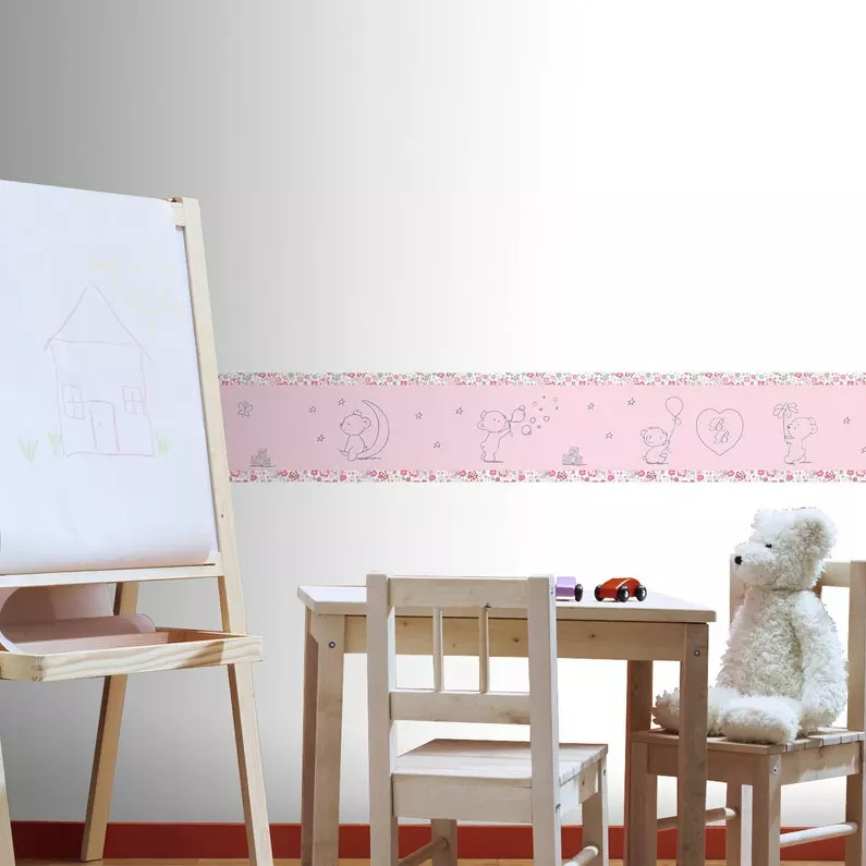 Frise papier peint adhésive Teddy Girl rose, idéale pour décorer les murs d’une chambre de fille.